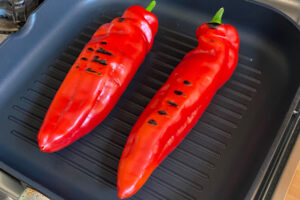 - Was de puntpaprika’s en rooster ze op de bbq of in een grillpan totdat ze gegaard zijn/zwarte strepen bevatten.