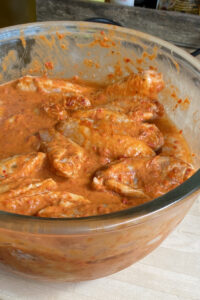 - Voeg vervolgens ca 300 ml yoghurt toe aan de basismarinade en roer alles nogmaals goed door. Voeg de kippenvleugels toe aan de marinade, dek de kom af en zet in de koelkast. Laat de marinade minimaal 4 uur, maar liever een nachtje intrekken.