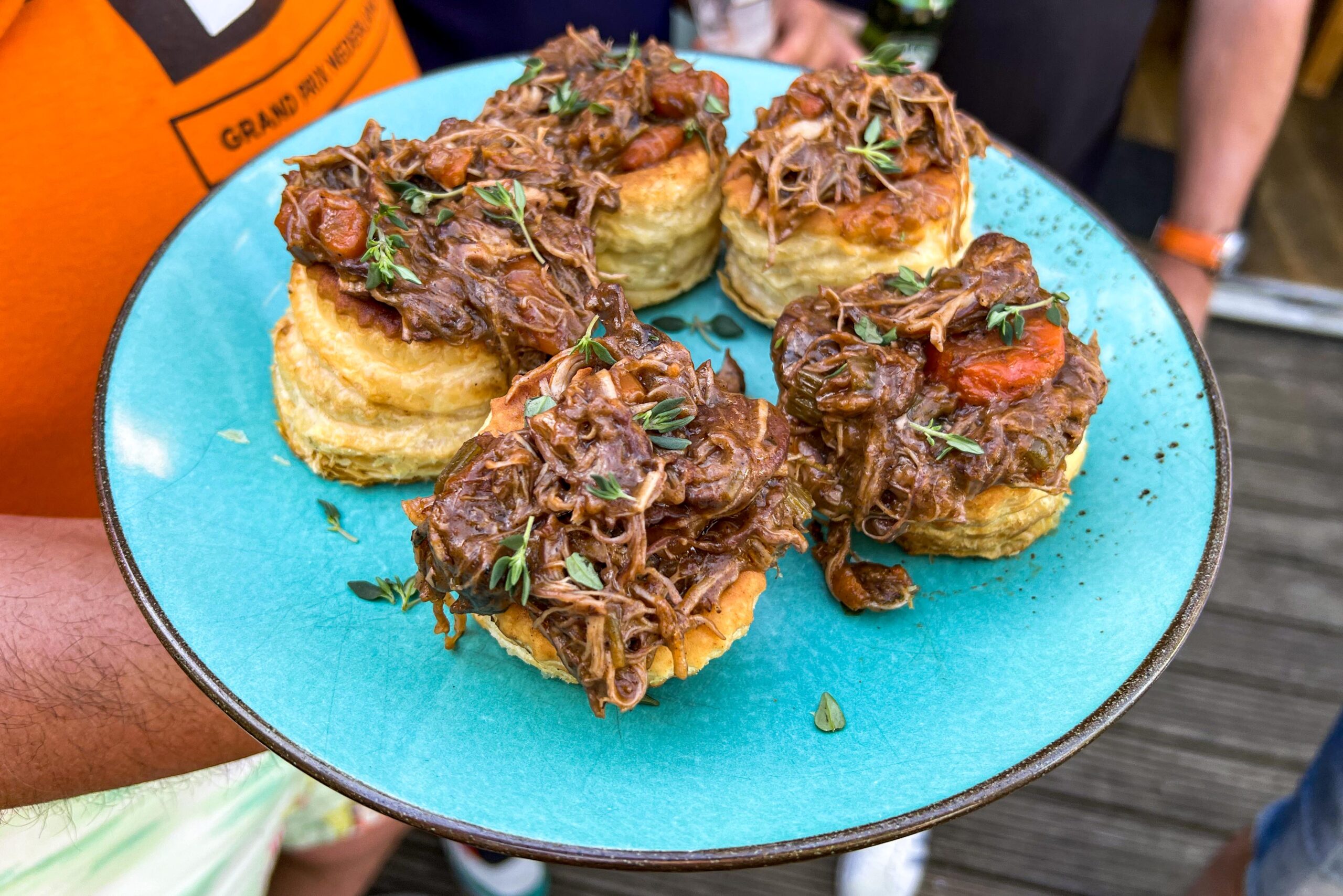 - Nu alleen nog even de ragoutbakjes bakken. Dit doen we uiteraard ook gewoon op de BBQ. Pak het rooster en doe daar voor je eigen gemak aluminiumfolie omheen. Op deze manier verdelen we de warmte beter en verbranden je bakjes niet. Leg de bakjes op het rooster en bak ze 4 minuten af op de barbecue, op zo’n 150 graden. Leg ze daarna op een bord en schep een royale hoeveelheid van de ragout in een bakje. Zet ze op tafel, pak wat bier en let’s hope dat Max, net als vorig jaar, Monaco op zijn naam schrijft.