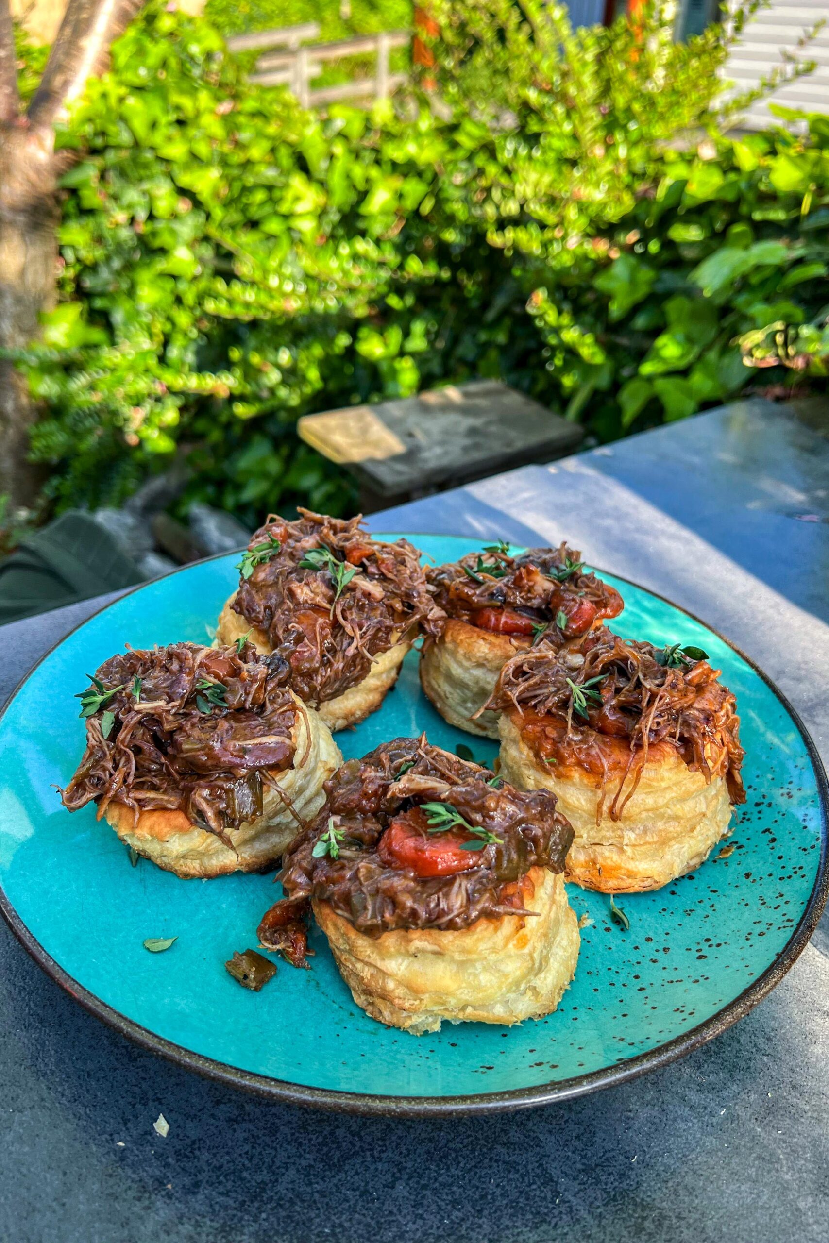 - Nu alleen nog even de ragoutbakjes bakken. Dit doen we uiteraard ook gewoon op de BBQ. Pak het rooster en doe daar voor je eigen gemak aluminiumfolie omheen. Op deze manier verdelen we de warmte beter en verbranden je bakjes niet. Leg de bakjes op het rooster en bak ze 4 minuten af op de barbecue, op zo’n 150 graden. Leg ze daarna op een bord en schep een royale hoeveelheid van de ragout in een bakje. Zet ze op tafel, pak wat bier en let’s hope dat Max, net als vorig jaar, Monaco op zijn naam schrijft.