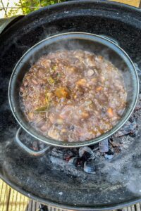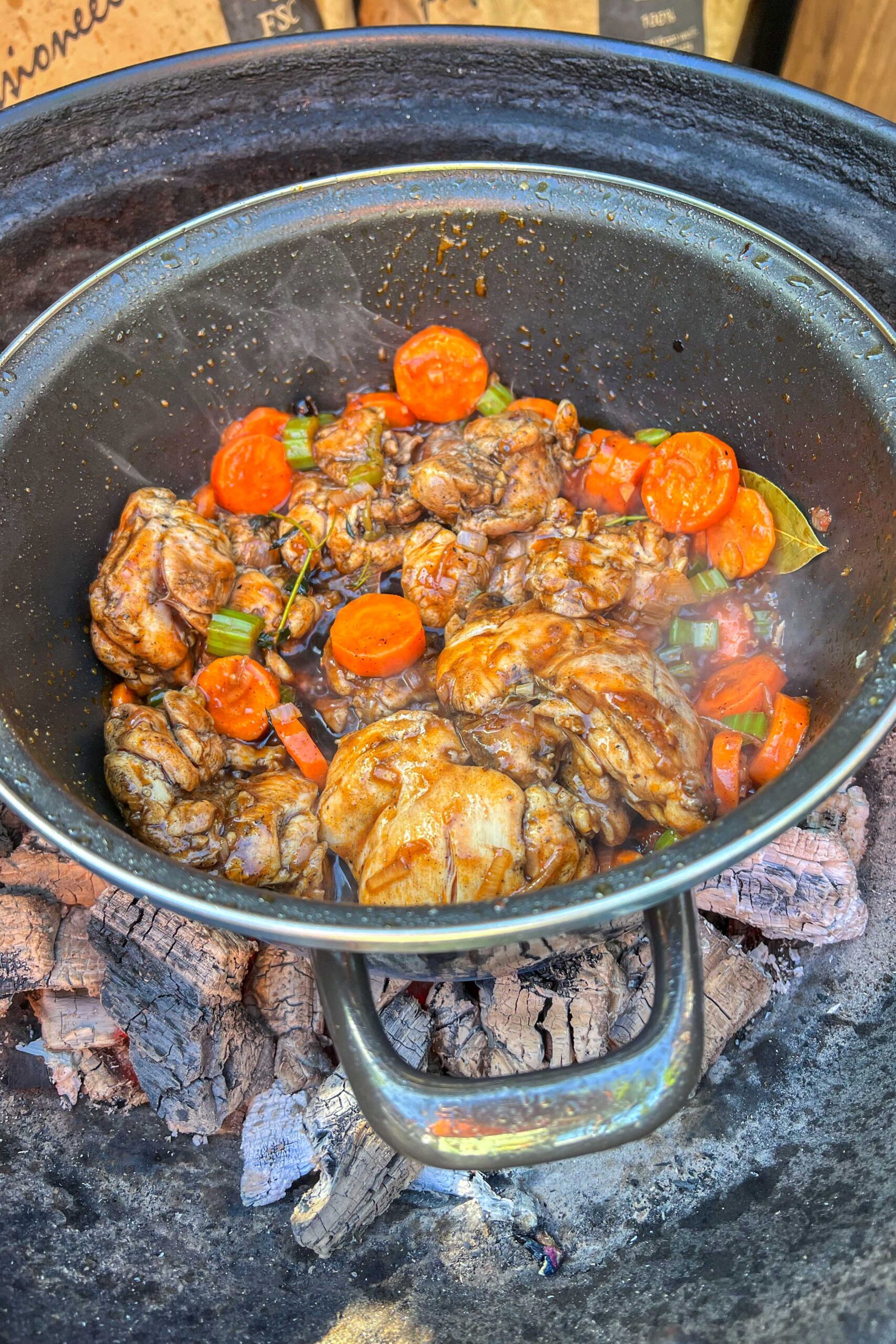 - Laat nu alles met de deksel op de pan ongeveer 2 uur door pruttelen, de binnentemperatuur van de barbecue mag dan wel iets lager, zo’n 130 graden. Roer wel regelmatig goed door. Als er te veel vocht uitgaat, vul dan bij met kippenbouillon en rode wijn. Proef halverwege de saus even en voeg eventueel naar wens extra zout toe.