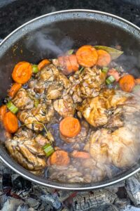 Voor de Monaco grand prix heb ik daarom Poulet au Vin bedacht. Een heerlijk mals en sappig kipgerecht wat we uiteraard serveren in hapklare porties zodat we het wel gewoon uit het handje kunnen eten. De Poulet au Vin kan je zien als een soort ragout. Uiteraard maken wij dit gerecht ook weer volledig op de BBQ. Kijk daarom even of je een pan (met deksel) hebt die rechtstreeks op het vuur gezet kan worden. Het zou zonde zijn als je een dure pan voor de inductiekookplaat gebruikt die dan kromtrekt. Dan heb je daarna niets meer aan je pan. Denk ook even aan de handvatten. Plastic handvatten niet op de BBQ zetten hè, dat gaat echt stinken en voor je het weet heb je geen handvatten meer. Ik heb even een emaillen pan gebruik. Zo nu zijn alle waarschuwingen wel geweest, aan de slag.”