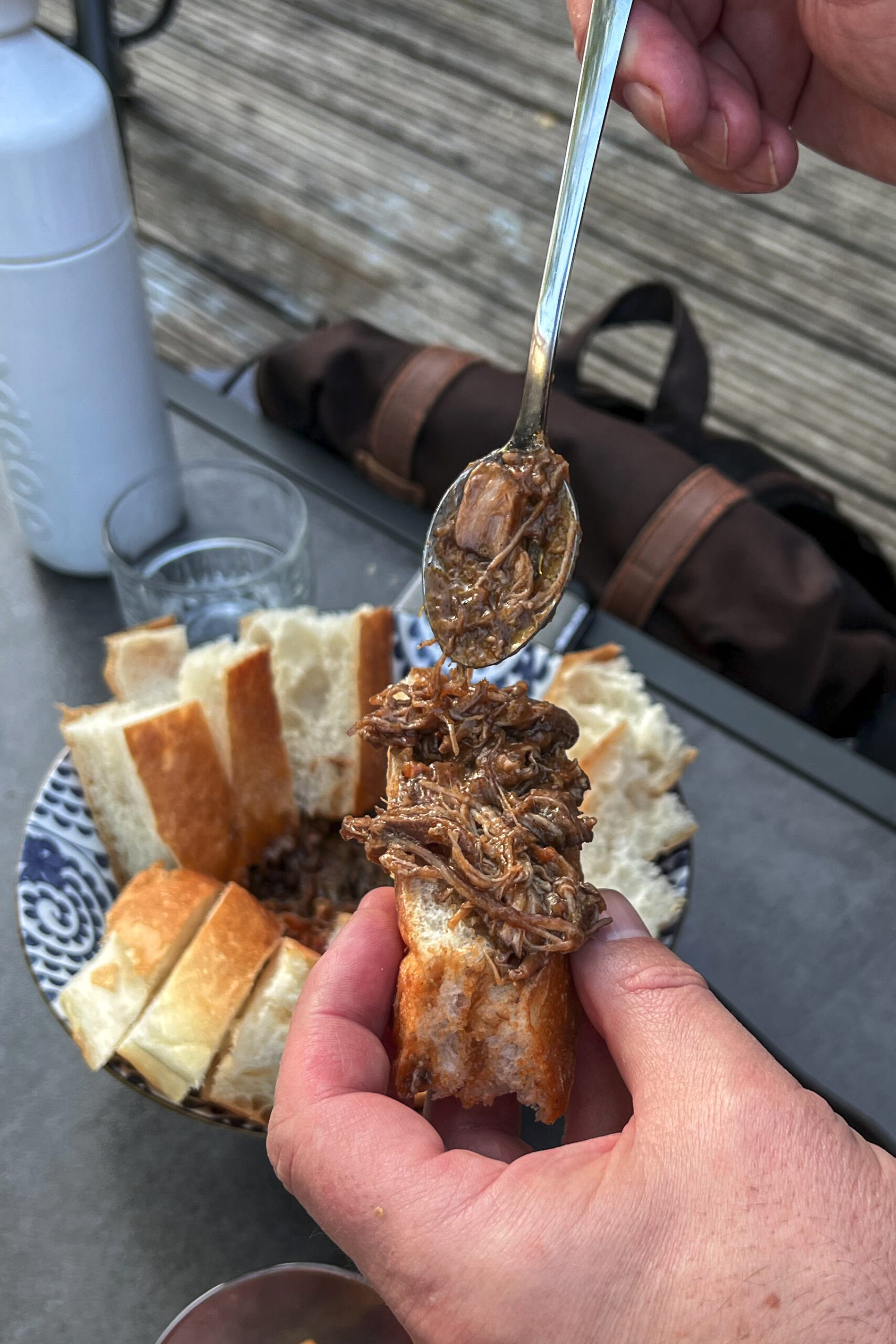 - Na twee uur pruttelen haal je de kippendijen, waar mogelijk, uit de saus. Het kan heel goed dat veel kip al uit elkaar gevallen is, laat het dan gewoon zitten. Pluk de kippendijen die nog groter zijn in sliertjes met behulp van 2 vorken.