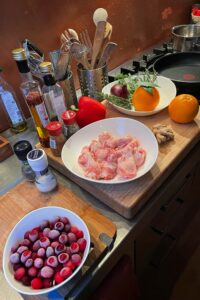 Eindelijk thuis en aan de slag met de diverse, verse, in Holland gekweekte en geproduceerde ingrediënten, nog wat kruiden uit eigen tuin en aangevuld met een sinaasappel.