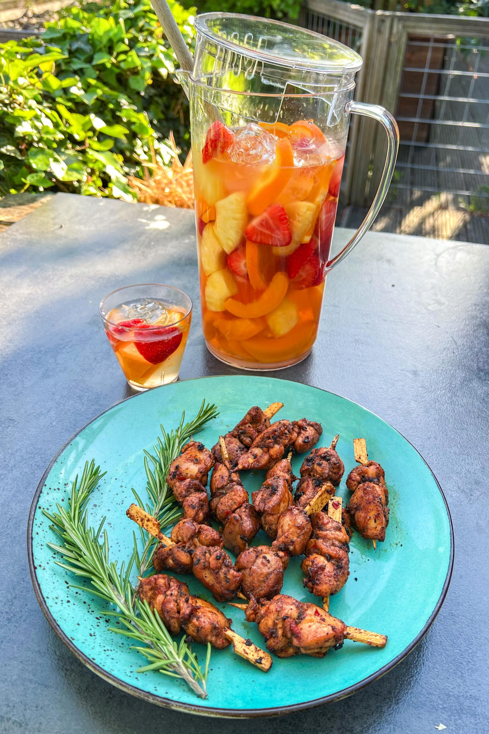 “De volgende F1-race van het seizoen wordt gereden in Barcelona. En lucky me mag daar een bijpassend kiprecept voor bedenken. Nou, daar weet ik wel raad mee. Want Spanje, dat is tapas eten. En van tapas eten krijg je dorst. Dat gaat helemaal goed komen. Ik breng jullie in Spaanse sferen met deze tapas van kleine kipspiesjes. En op zijn Spaans klinkt dat nog veel lekkerder: pinchitos de pollo. Om het helemaal af te maken serveer je daarbij een verfrissende witte Sangria. Nog gezond ook, want boordevol fruit ;-).