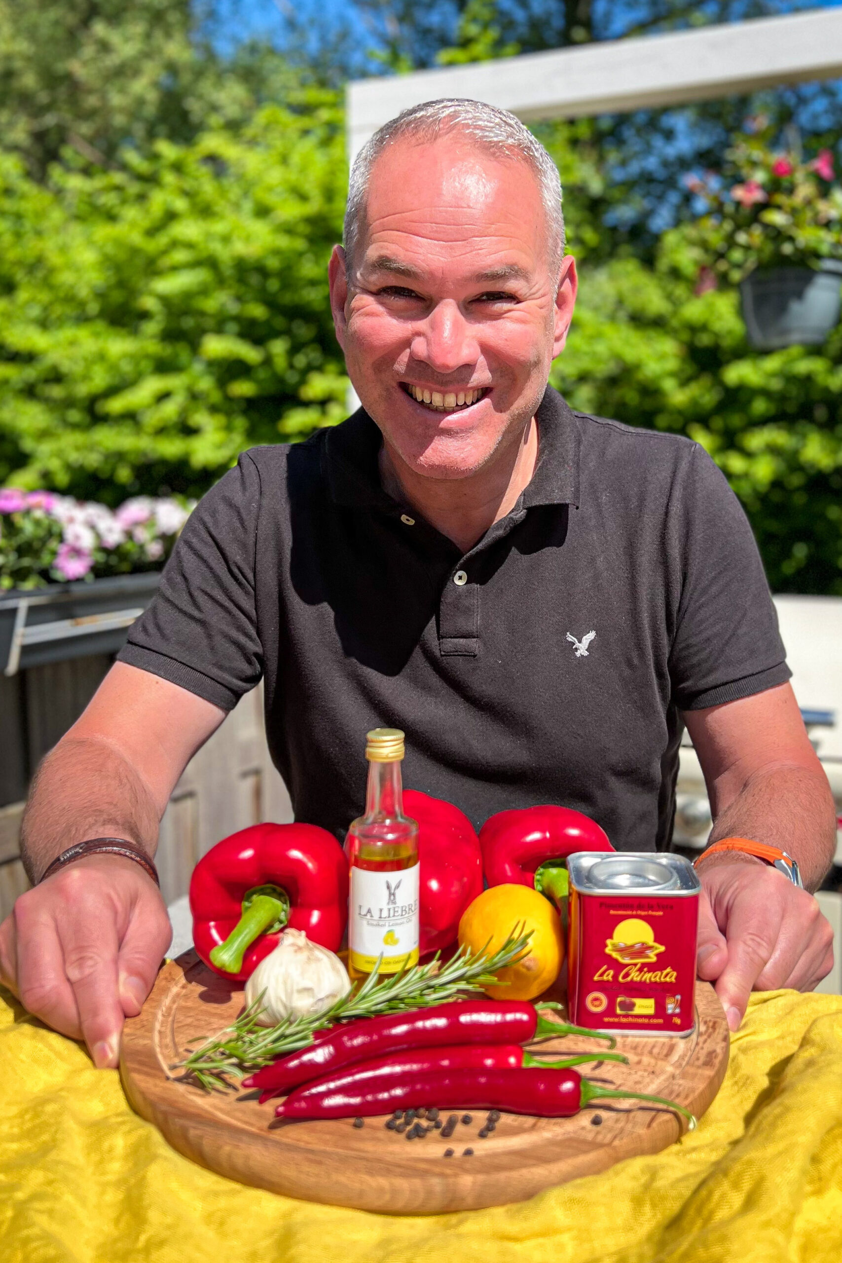 We beginnen met de kip: Een lekkere kipdij, opgesneden in rijgbare blokjes. Die gesneden kip gaat eerst minimaal 5 uur, maar liever een hele nacht in de marinade. Die Spaans getinte marinade maak je van groenten zoals paprika’s, Spaanse pepers, uien, knoflook en diverse specerijen zoals paprikapoeder en chilipeper. Het uitgebreide recept vind je hieronder. Alleen die kleuren al. Helemaal Spaans toch?”