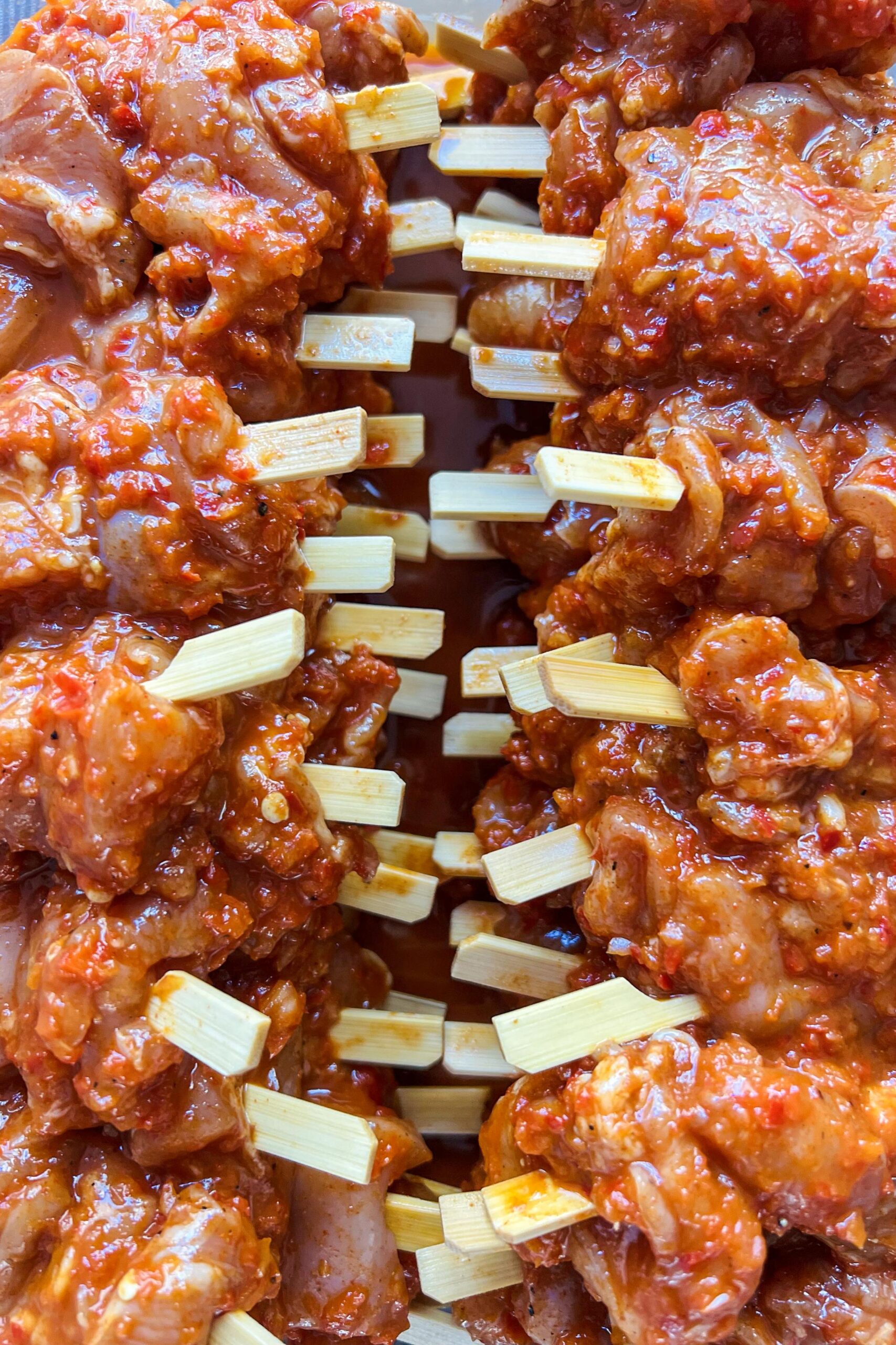 - Week op het laatst voldoende kleine satéprikkers in water (ca 20 voor 500 gram) en rijg de gemarineerde kipblokjes aan de prikkers. Met korte spiesjes is 2 – 3 stukken kip per spiesje prima.