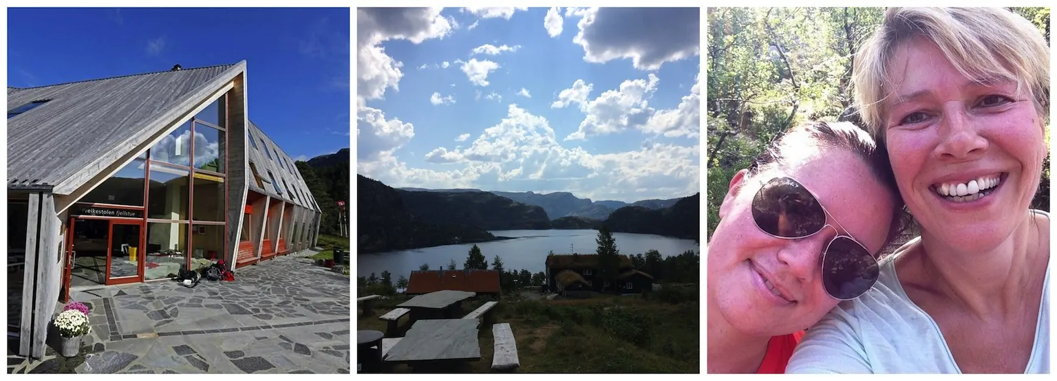 Ik ben gewoon niet zo actief, vond het echt zwaar bij 30 graden, had geen eigen schoenen aan (had ik al gezegd dat mijn bagage vertraagd was?) en ik was het zat. Samen met Simone haakten we af en wandelden rustig terug naar beneden, ietwat opgelucht terwijl de rest rustig ging doorklimmen. We waren blij dat we niet over onze grenzen heen gingen en hebben heerlijk genoten beneden bij de Preikestolen fjellstue lodge met een kaneelbroodje en een spectaculair uitzicht. Ook wandelden we nog even naar het idyllische strandje bij het meer. Heerlijk om even met je voetjes in te baden na een flinke hike.