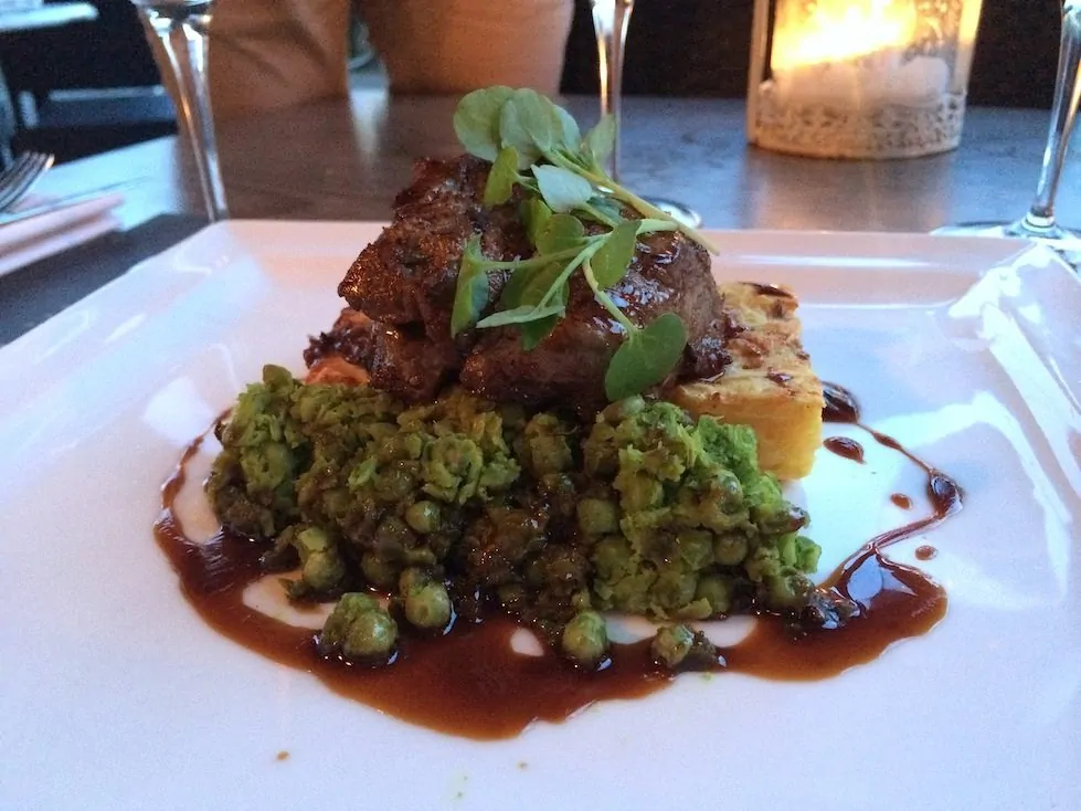En de lamslende gemarineerd in lavendel, met aardappel rösti en tuinerwten-munt puree.
