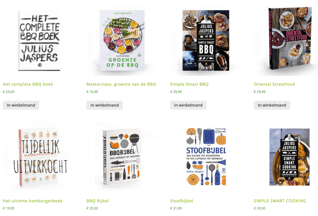 Uit ervaring weet ik dat een van de kookboeken van Julius Jaspers altijd in de smaak vallen als cadeau! Nu met het prachtige weer heeft hij genoeg keuze uit barbecue kookboeken, maar ook de stoofbijbel is zeer de moeite waard. Kijk in zijn webshop voor alle kookboeken. Of koop ze bij je lokale boekhandel of online, zoals hier bij bol.com.