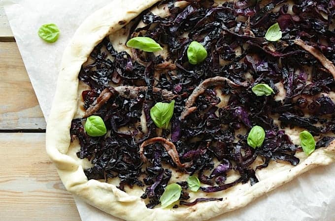 Niet te veel poespas en erg lekker, dat is deze pissaladière met rode kool. Het heeft ook iets gezelligs vind ik en daarom fijn voor op de zaterdag.