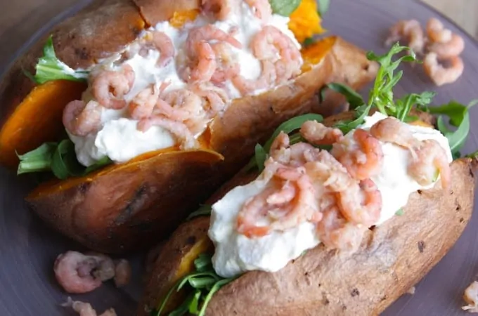 En dan door naar wat makkelijks maar zo smakelijk. Namelijk de gepofte zoete aardappel met Hollandse garnalen.