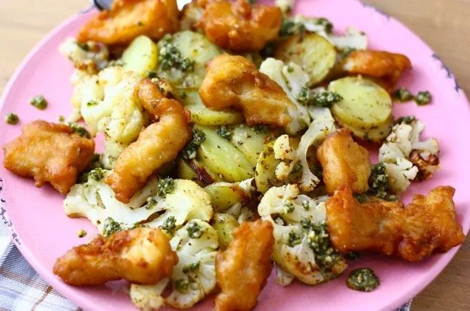 Dit gerecht met geroosterde bloemkool, pesto en kibbeling is bovenal een feestje om te eten. Daarnaast staat het ook nog eens heel snel op tafel.