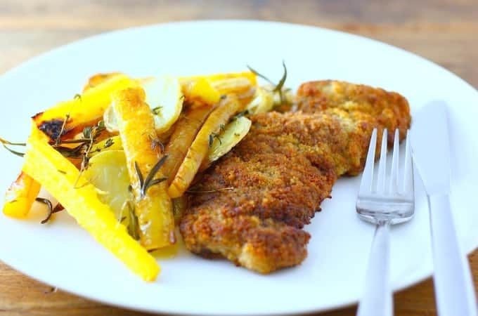 Deze schnitzel met ovengroenten behoeft denk ik weinig uitleg. In Oostenrijk heb ik een keer (wel samen hoor) eens een schnitzel van een halve meter lang gegeten. Getraind schnitzeleter dus 😉