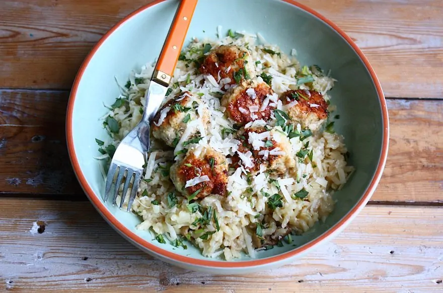 Ik heb al weken zin in risotto en vooral in deze versie met kipgehaktballetjes en dragon. Kipgehakt kun je bij de Turkse slager kopen (maken ze vaak ter plekke voor je) en verse dragon vind je bij de betere groenteboer. Eventueel kun je daar ook gedroogde dragon voor gebruiken.