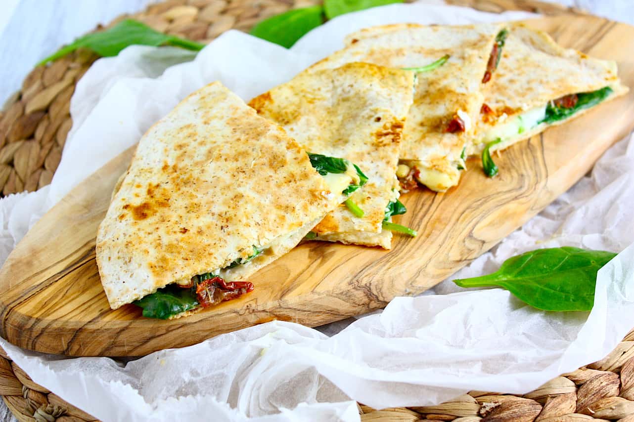 Heb je nog spinazie over van maandag? Maak dan deze quesadillas met geitenkaas en spinazie als lunch. Dat wordt smullen.