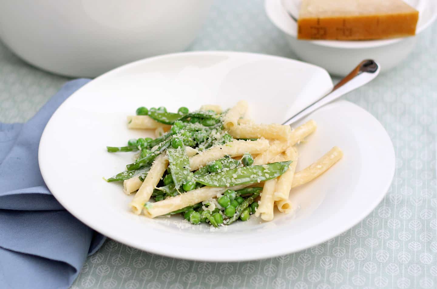 Vandaag staan de lentegroenten centraal in deze pasta met peultjes, doperwten en groene asperges.