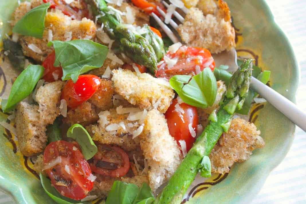 Aan het begin van de week maak ik het oude brood op van het weekend door deze te verwerken in een panzanella met groene asperges. Deze keer heb ik het brood niet geweekt, maar gebakken. Een heerlijke twist.