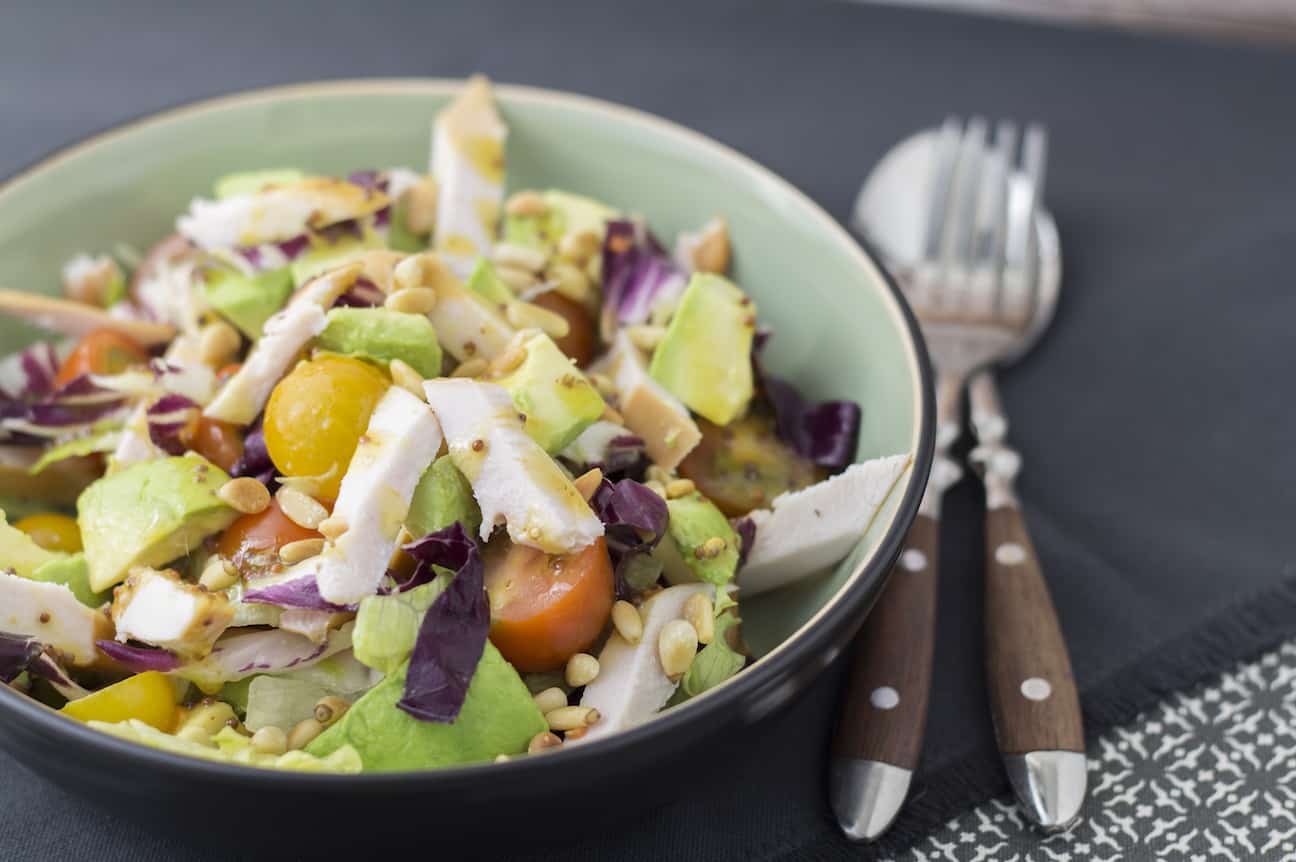 Het is een werkje van niks, deze salade met avocado, gerookte kip en honing-mosterddressing. Maar lekker dat ‘ie is.