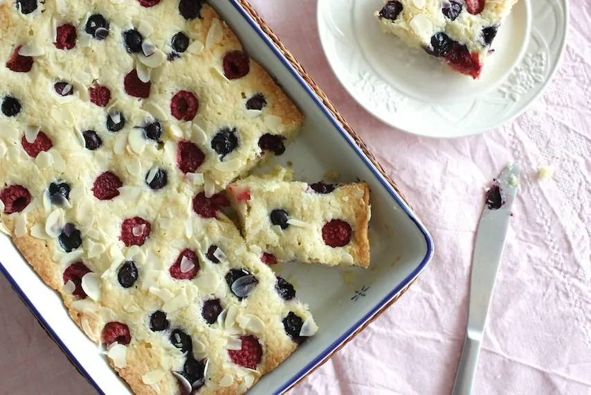 Deze plaatcake met bosbessen en frambozen is een heerlijke zomers gebakje voor de zondag.