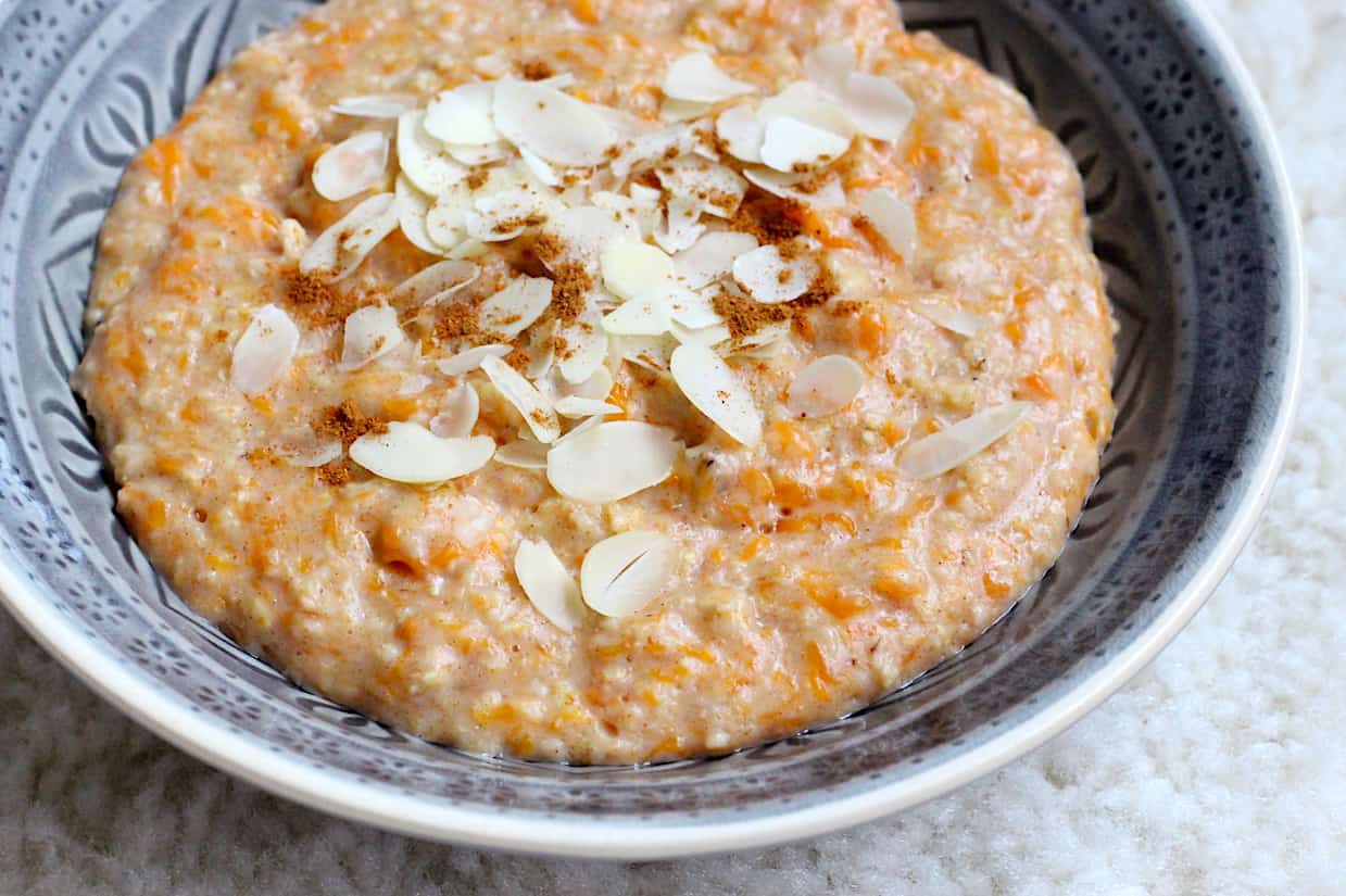 Als de blaadjes van de bomen zijn gevallen schakel ik voor het ontbijt weer over naar havermout. Deze romige havermout met pompoen, kaneel en amandelen is een heerlijk begin van de dag. En zo heb je met je ontbijt gelijk al 100 gram groenten binnen.