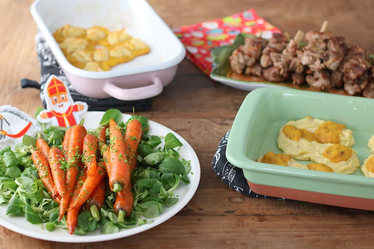 Kipspiesjes met speculaaskruiden, pureeletters en gekarameliseerde wortels