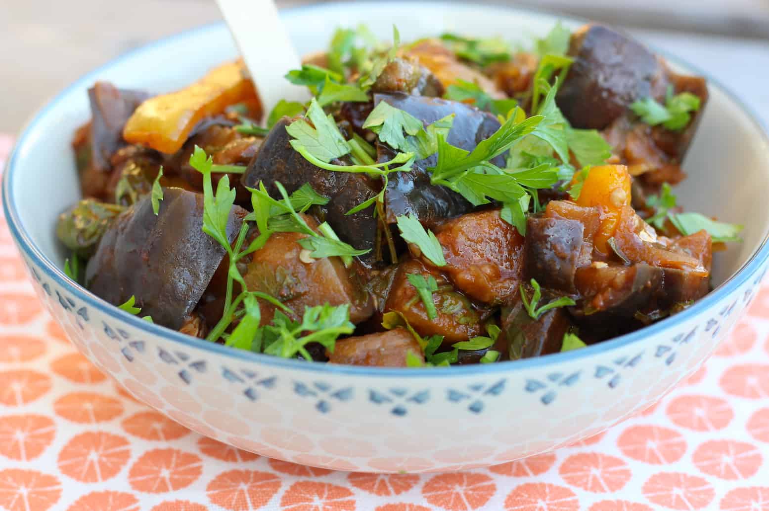 Als je meer groenten op een dag wilt eten is mijn beste tip om groenten toe te voegen aan je ontbijt en lunch zodat je niet ‘afhankelijk’ bent van alleen je avondmaaltijd om 250 gram groente binnen te krijgen. Zo vind ik het zalig om te lunchen met groenten. Deze caponata met een Indonesisch tintje is daar super voor, lekker met geroosterd brood om in de saus te dopen. En als je daar volkorenbrood voor neemt, heb je ook gelijk weer wat extra vezels binnen.