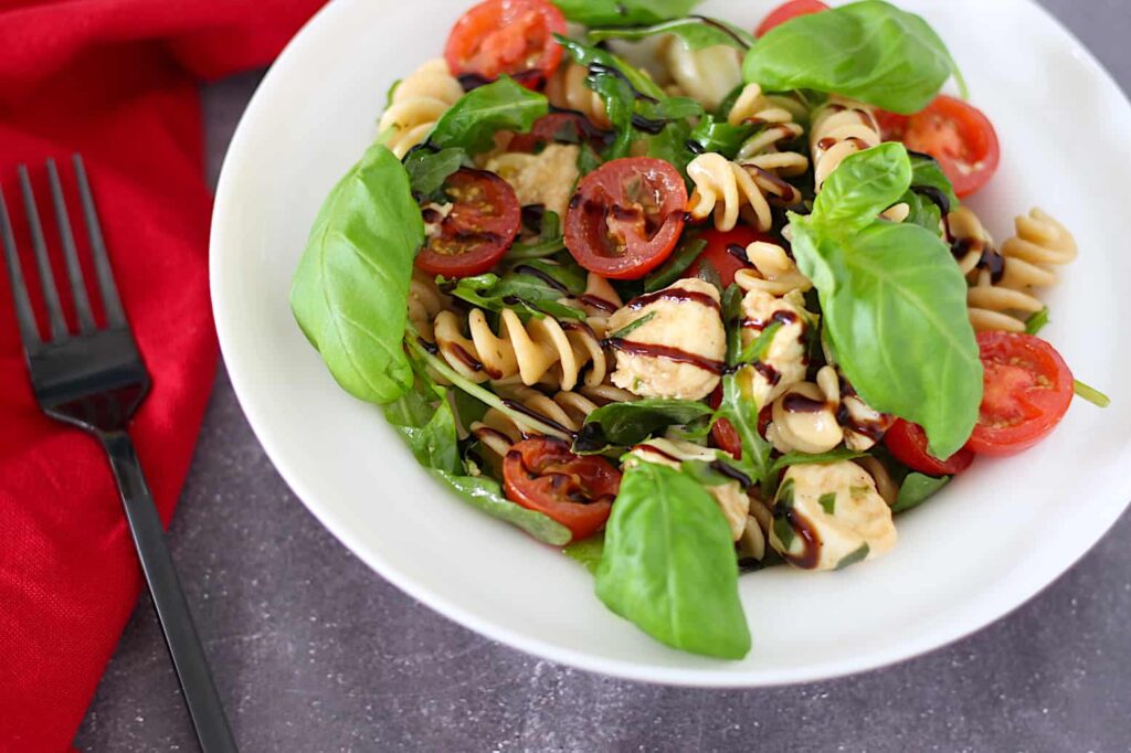 Met de ingrediënten van een traditionele salade caprese kun je ook een heerlijke pastasalade maken. Ik voegde er nog wat balsamicoazijn en rucola toe, wordt de salade nog lekkerder van.