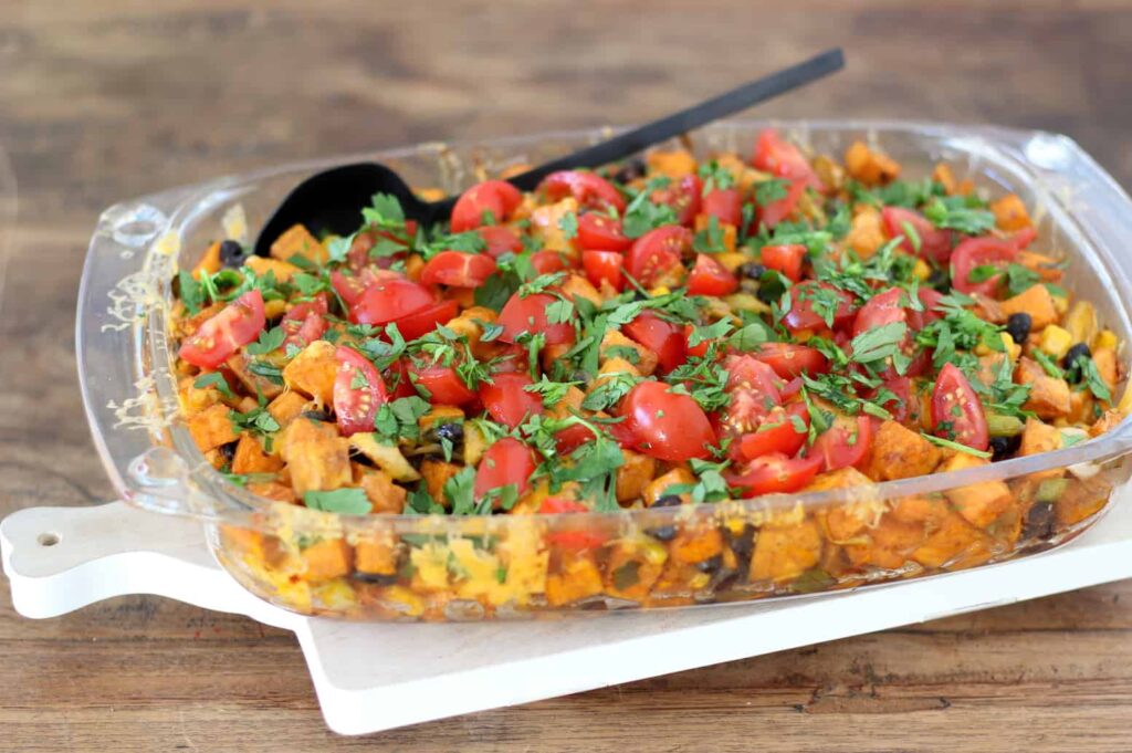 De combinatie van zoete aardappel, zwarte bonen, specerijen en cheddar kaas maakt deze ovenschotel zalig. Makkelijk voor te bereiden en de oven doet de rest van het werk.