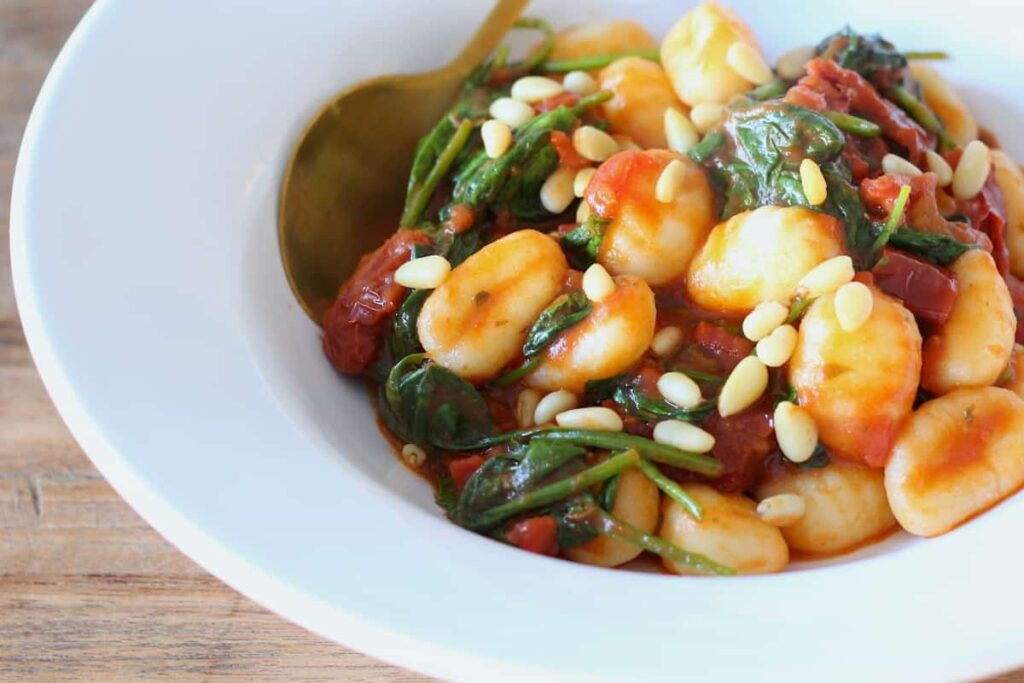 Het kost je 25 minuten van je tijd en dan is deze heerlijke gnocchi met spinazie en zongedroodgde tomaten al klaar. Heerlijk voor het hele gezin. En ben je nou geen fan van gnocchi, vervang deze dan door korte pasta.