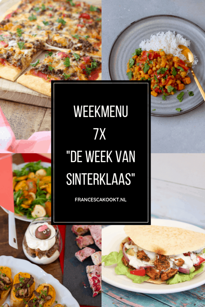 In het weekmenu heb ik deze week ook uiteraard rekening gehouden met Sinterklaas. Dat was niet zo ingewikkeld, want dit jaar heb ik voor jullie een geweldig buffet bedacht (samen met Debbie) voor pakjesavond. Met 8 makkelijk voor te bereiden gerechten die je op de avond zelf alleen nog hoeft op te warmen of uit de oven of koelkast haalt. De andere dagen heb ik mijn inspiratie uit de rest van de wereld gehaald, daar had ik zin in. Eet lekker!