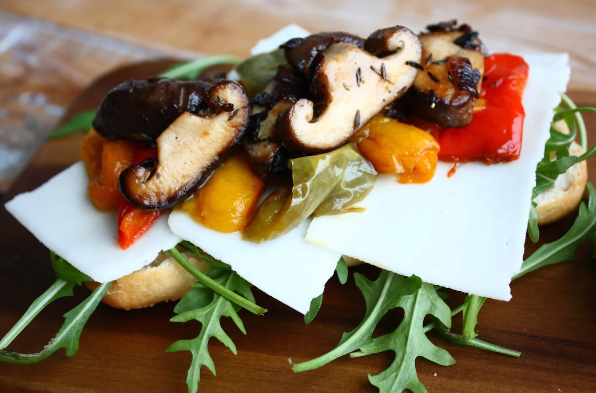 Broodje geitenkaas met geroosterde paprika, shiitake en rucola