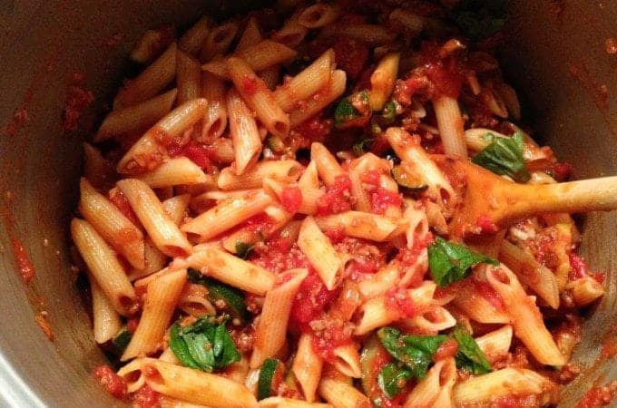 Een supersimpele pasta voor het hele gezin die je ook nog eens met een klein budget kunt maken: penne met gehakt, courgette en basilicum.