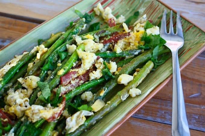 Wat groene asperges in de grillpan of op de BBQ, geklutst ei, chorizo en blauwe kaas. Meer heb je niet nodig voor deze heerlijke salade.