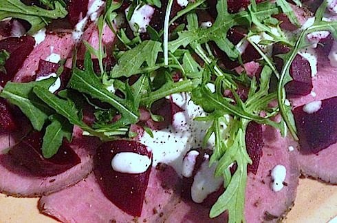 Vandaag eten we met een salade, maar dan wel een hele bijzondere: rosbief carpaccio met balsamico bietjes.