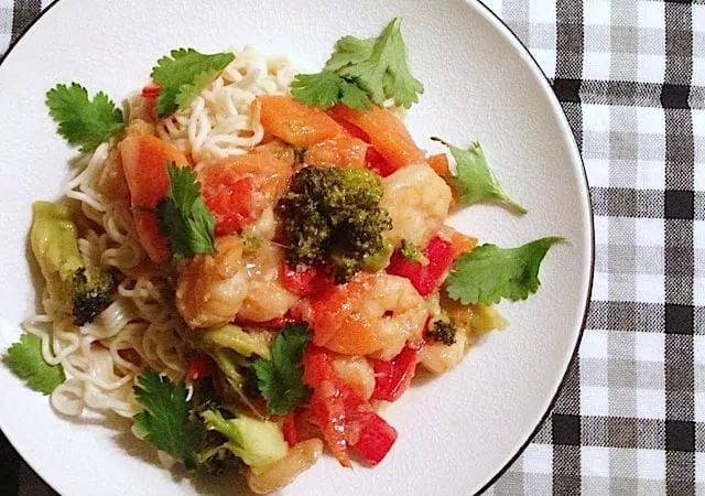 Een heerlijk bordje met Thaise wokgarnalen, verse groenten en noodles staat er vandaag op het menu.