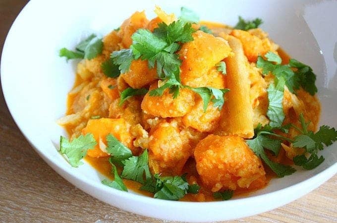 Een vegetarische curry is minstens net zo lekker als een variant met vis en vlees. Deze zoete aardappelcurry met bloemkool is daar het bewijs van en je hebt ‘m ook nog eens zo gemaakt.