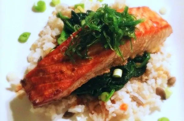 Een heerlijk stukje zalm uit de oven. Gemarineerd in een sojadressing en geserveerd met spinazie, notenrijst en zeewier.