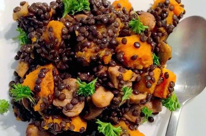 Voor vandaag heb ik een herfstige salade met pompoen, champignons en linzen op het menu staan. Van de andere helft pompoen kun je een pompoensoepje maken. Uitje fruiten, stukjes pompoen erbij met wat bouillon en laten pruttelen totdat de pompoen gaar is. Daarna fijnmalen met de staafmixer en klaar is je pompoensoep.