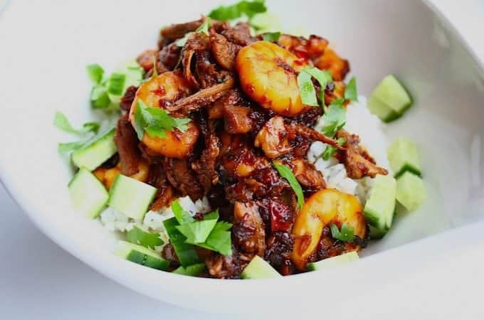 Heerlijk comfort food voor de vrijdag: kip ketjap met garnalen en witte rijst. Bepaal zelf hoeveel peper je toevoegt, afhankelijk van wie er allemaal mee eten.