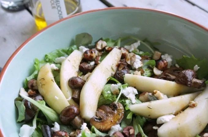 Een lichte salade vandaag. Met peer, hazelnoten, champignons, balsamico en geitenkaas. Een bordje vol smaken van dit seizoen.
