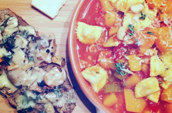 Een goedgevulde, winterse minestrone met pompoen en bonen. Daar beginnen we de week mee. Heerlijk met de gegratineerde paddenstoelenbroodjes erbij.