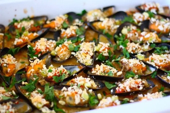 Heb je weleens mosselen gegratineerd? Met dit recept kun je het mooi een keer uitproberen. Heerlijk met de oestersaus en chili olie ‘on the side’.