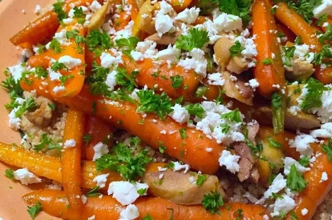 De bospeen en kip voor dit recept rooster je heel makkelijk samen in de oven. Combineren met de bulgur en feta en je bent al klaar.