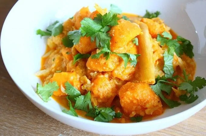 Deze heerlijke zoete aardappelcurry met bloemkool bewijst dat je ook heel goed een curry kunt maken zonder vlees. In plaats van witte rijst kun je er ook zilvervliesrijst of zelfgebakken naan erbij serveren.