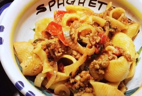 Een ‘gewoon’ bordje met pasta, gehakt, ui en tomaat. Daar is echt helemaal niets mis mee.