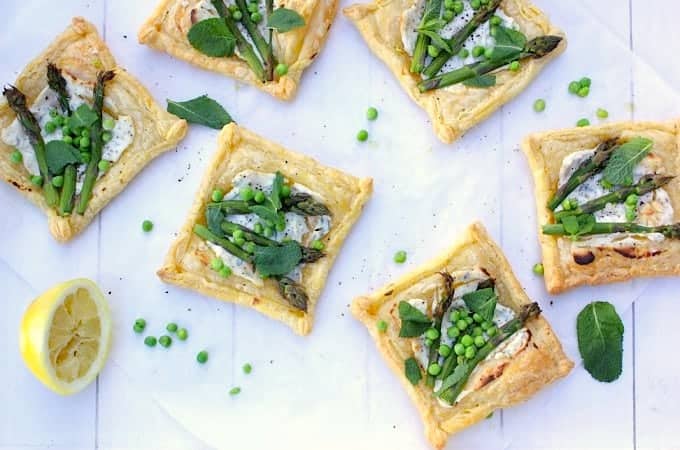 Heerlijke lentetaartjes met groene asperges, doperwten en munt. Voor de lunch of als hapje bij de borrel.