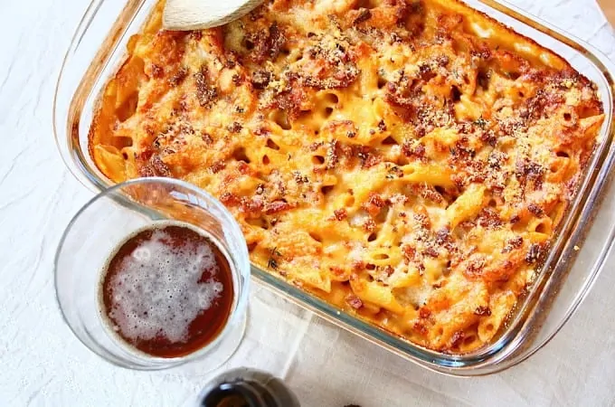 Comfort food vrijdag met mac & cheese met bier en spekjes van Dominique. En verrassing: het gerecht is vleesloos, want we hebben vegetarische speckjes gebruikt en dat proeft echt niemand!