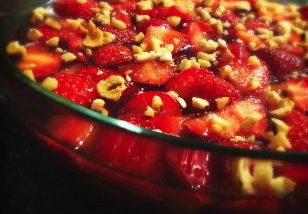Om je vingers bij af te likken – Groene theegelei met aardbeien en hazelnoten