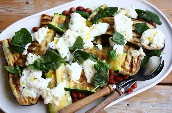 Dit blijft toch wel een van mijn favoriete salades. De gegrilde groenten combineren zo goed met de buffelmozzarella en borlotti bonen. Voedzaam en zalig.